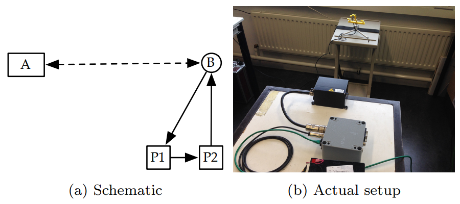 この検証では、LiDAR(A)から1mの距離にトランシーバ(B)を設置しています。トランシーバには2つのパルス生成器(P1, P2)が接続されており、トランシーバがLiDARの入力信号を受け取ると、P1->P2->Bの順に信号が伝搬され、この伝搬の過程で遅延が発生します。また、パルス生成器が生成した(LiDARの受信信号に似た)信号をトランシーバ経由でLiDARに送信する仕組みになっています。