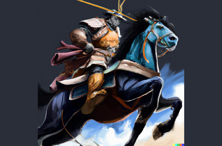 入力した文章のとおり、「馬に乗った侍がリアルな描写」で描かれています(この画像は、文章の入力から数秒足らずで生成されました)。