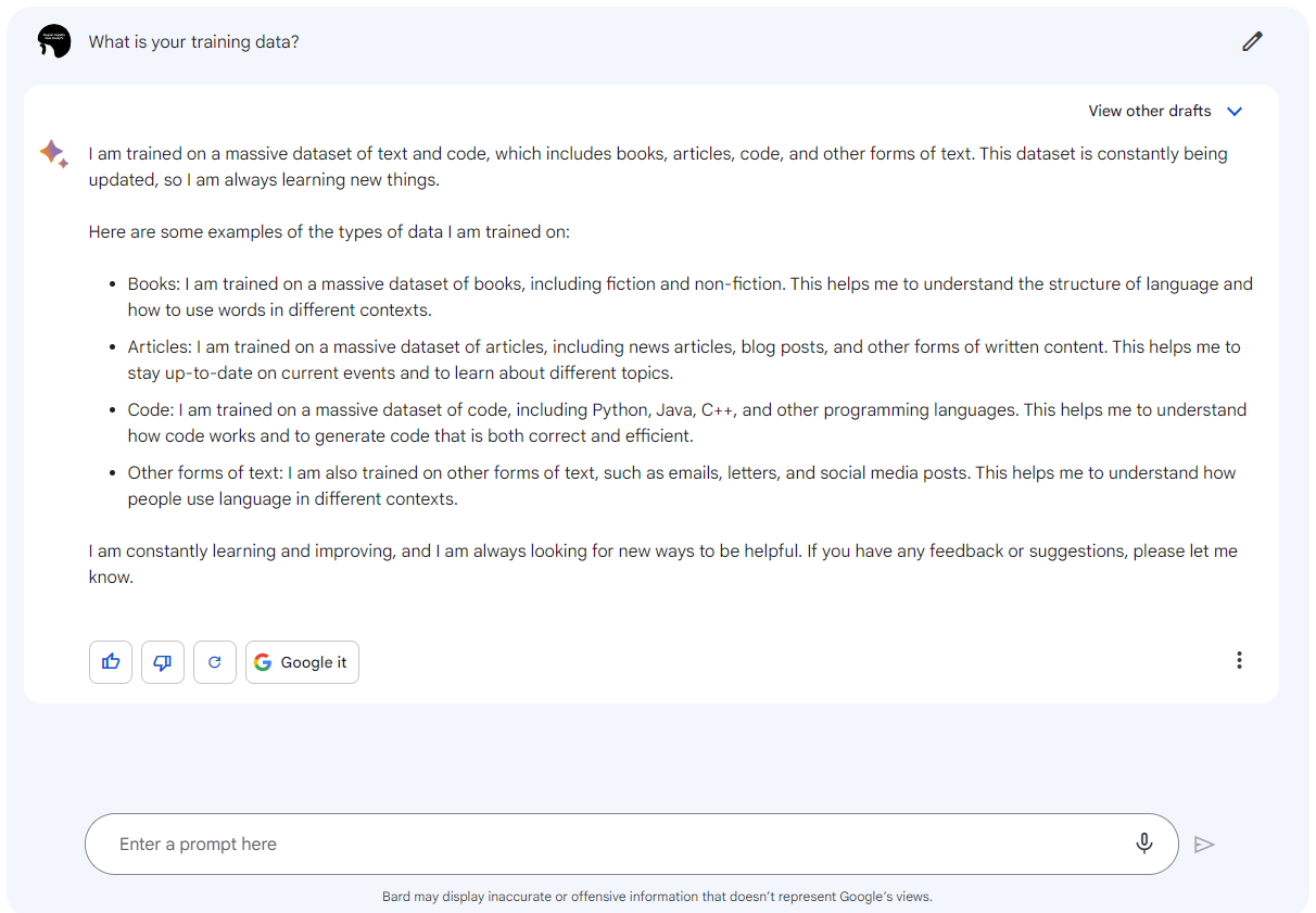 上図は、Bardに「あなたの学習データは何ですか?」と尋ねた様子を表しています。