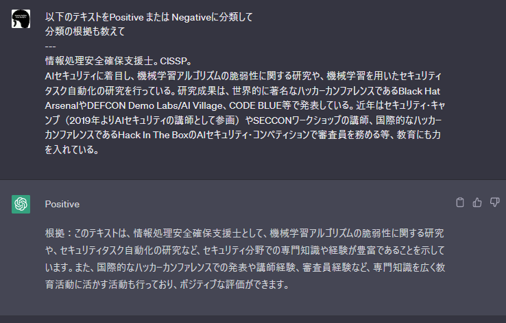 ChatGPTなど生成AIはテキスト分類器としても有用であり、ユーザーが入力した文章を自動的に分類(仕分け)することが可能です。以下の図は入力文章が肯定的(Positive)なのか否定的(Negative)なのかをChatGPTに分類してもらった様子を表しています。
