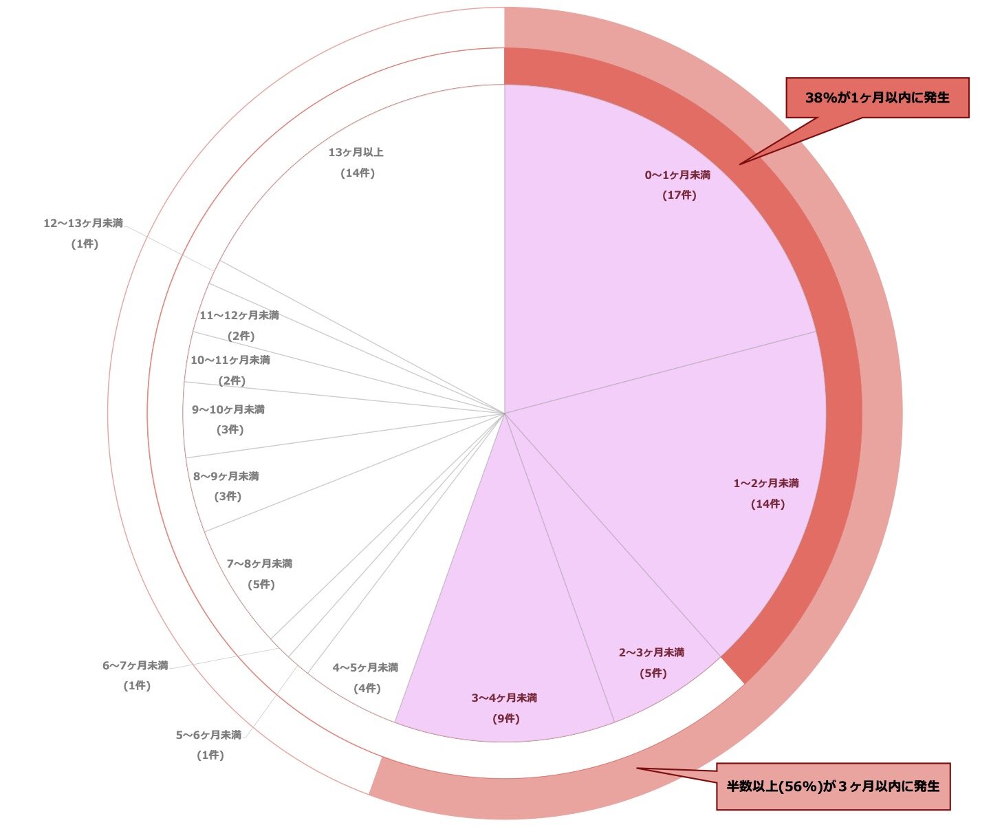 下記図2は、2回以上掲載された多重被害(累計81件)がどれほどの期間を空けて発生したかという割合を示したグラフです。調査の結果、約38%が1ヶ月以内、半数以上(約56%)が3ヶ月以内に発生していることが判明しました。