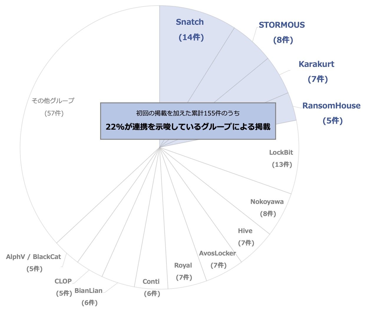 それを示すように、図1で示した多重被害には48(※)の攻撃グループが関与しており、このうち約22%にあたる34件は、日常的な言動やその他の調査から他の攻撃グループと協力していることが示唆されている4グループによるものでした(図3)。