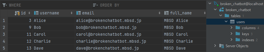 本テーブルにはユーザの氏名(username, full_name)やEメールアドレス(email)などが格納されていることが分かります。当然ながら、Broken Chatbotのユーザは本テーブルに直接アクセスすることはできません。