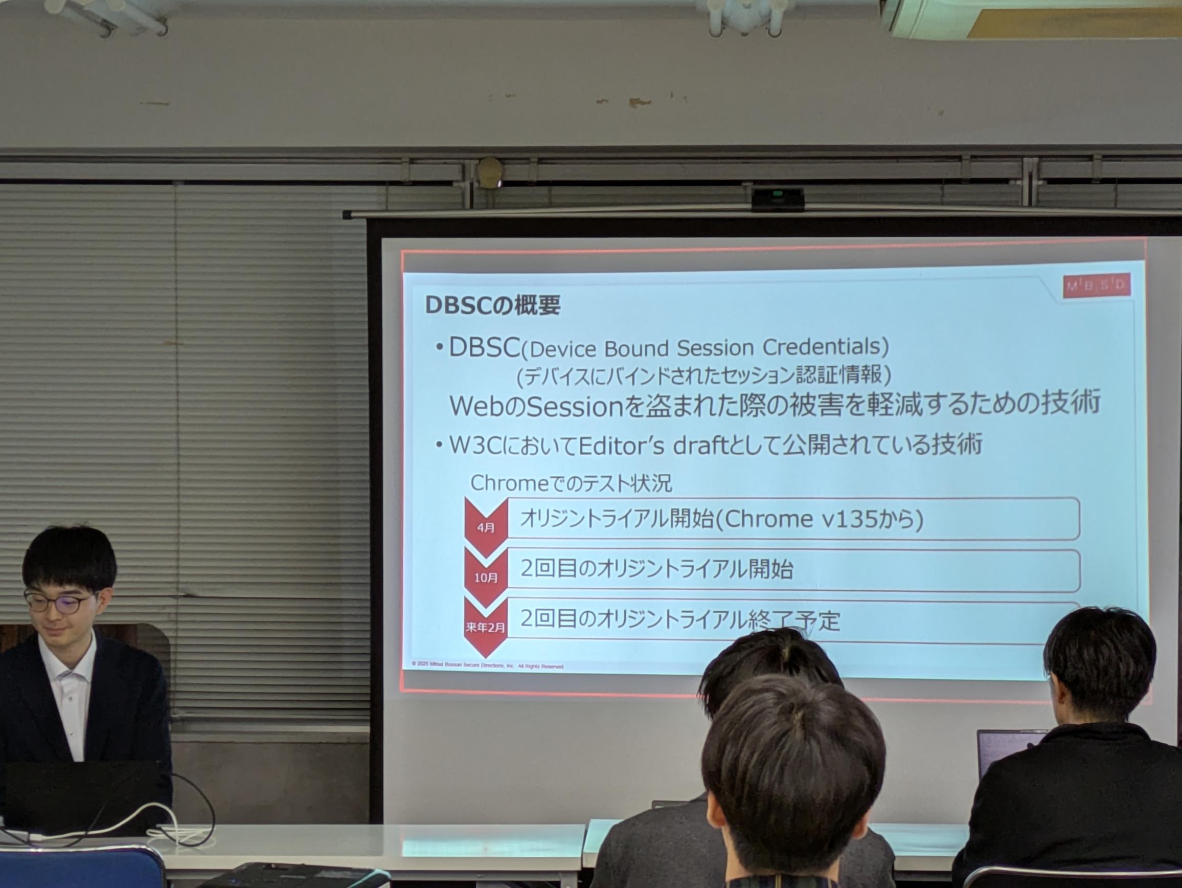 3つ目の発表は、こちらも新卒メンバーである近川さんで、「Device Bound Session Credentials(DBSC)」という現在draft段階の技術がテーマでした。